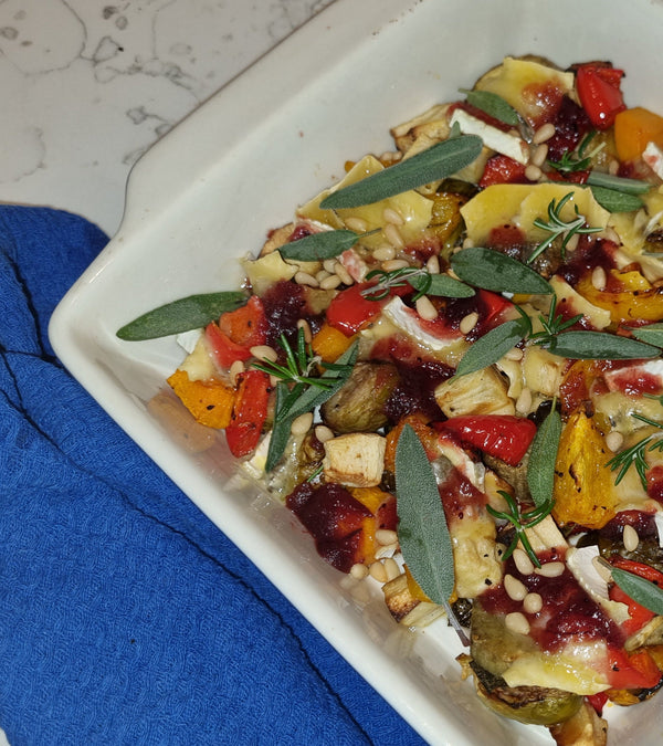 - Dot the brie over the roasted vegetables, then return to the oven for 5-8 minutes until melted.